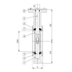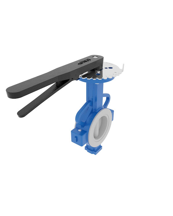 Nodular Cast Iron two piece body and stainless steel two piece stem. Superior corrosion resistance with PTFE seat and disc coating. Standardized pattern for actuator mounting.