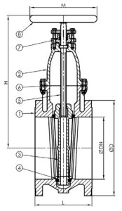 Gate valve used as shut off in cooling, sea water and shipside applications. Multiturn operation. Non-rising stem. Without indicator.