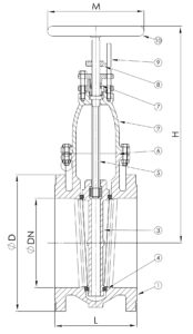 Gate valve used as shut off in cooling, sea water and shipside applications. Multiturn operation. Non-rising stem.