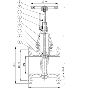 RG5 body gate valve, RG5 wedge and seats. Non rising stem with open/close indicator and bolted bonnet. Flat face flanges.