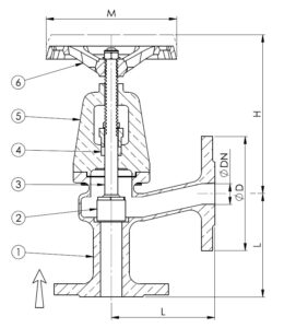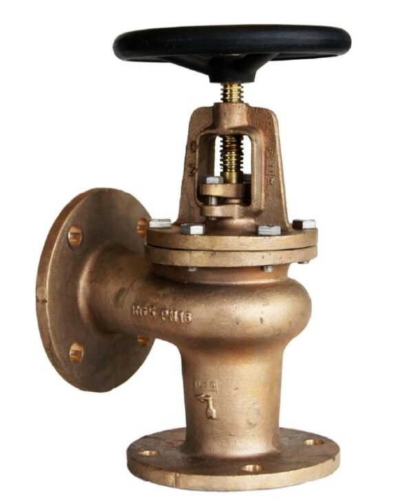 Globe valve with shut off , regulating or screw down non return (SDNR) function. Angled, rising stem valve with bolted bonnet and metal sealing. For warm sea water it is recommended to use a stem of zinc free bronze, CuSn6.
