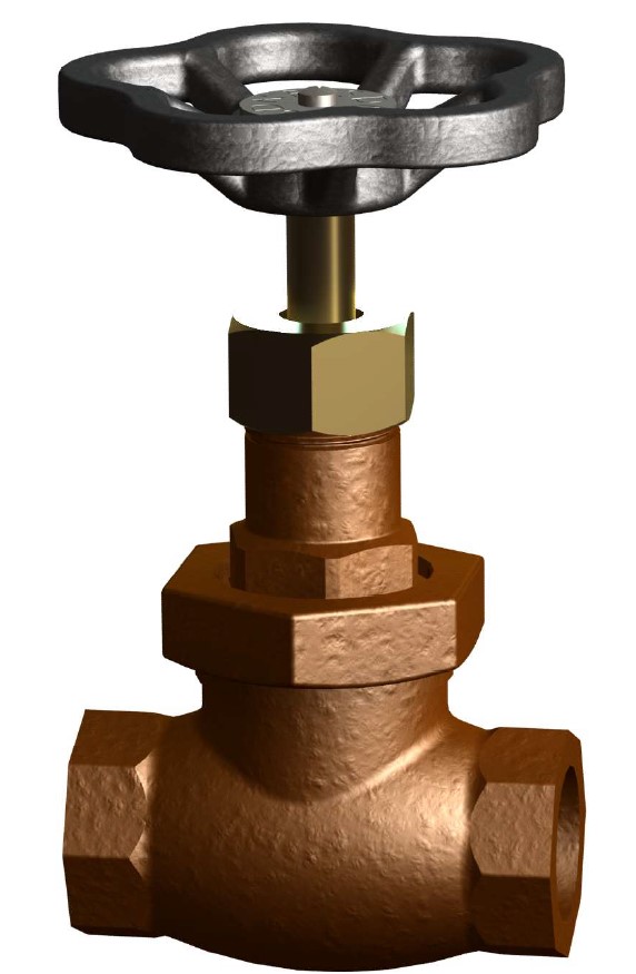 Globe valve with shut off or screw down non return (SDNR) function. Straight, rising stem type with female threaded ends, screwed and secured bonnet as well as PTFE sealing. For warm seawater it is recommended to use a stem of zinc free bronze, CuSn6.